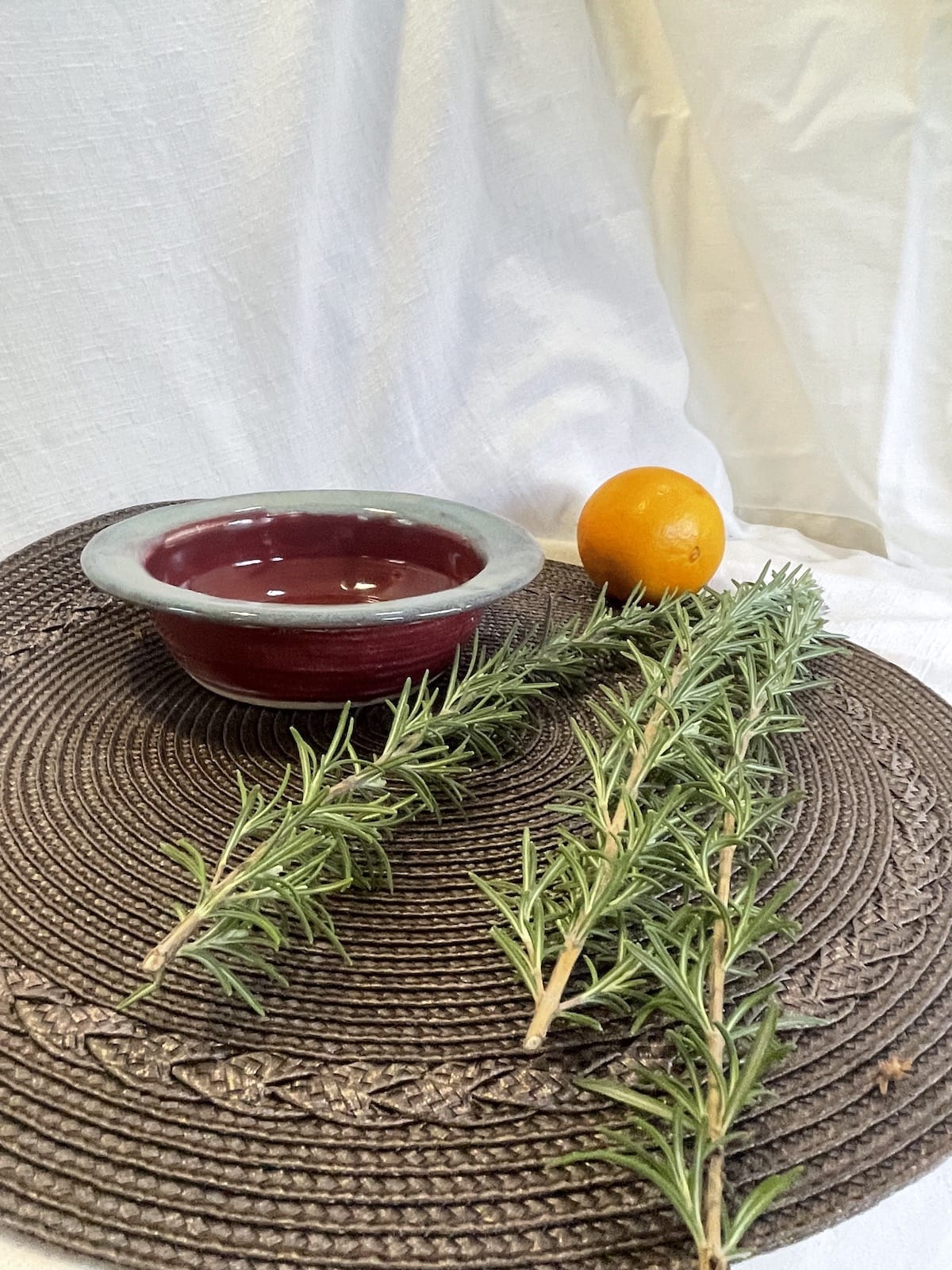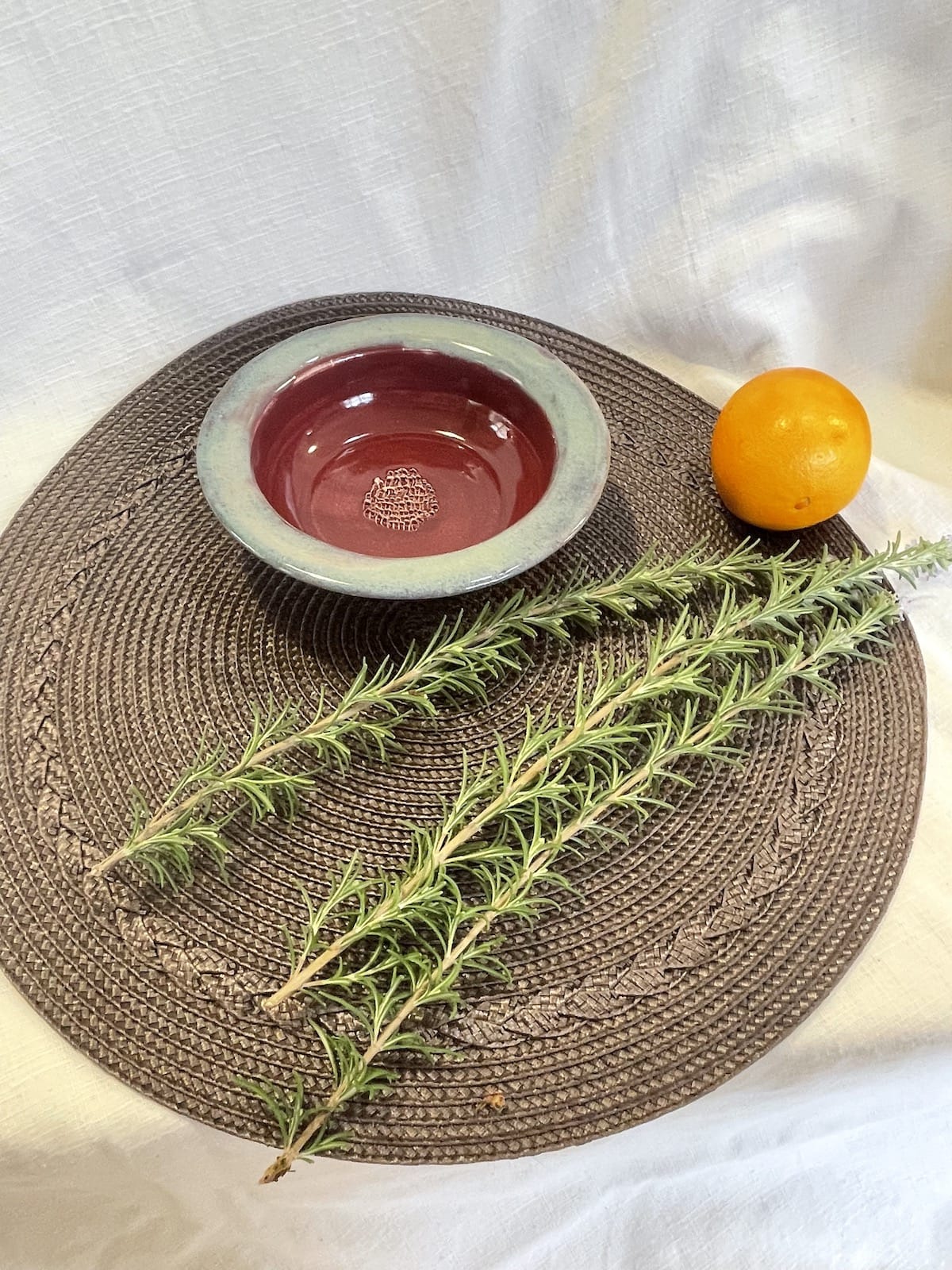 A hand-thrown garlic grater and olive oil dipping bowl glazed in a rich cranberry red, finished with a soft blue rim. The textured center grates garlic easily into a fine paste for mixing with olive oil, herbs, or citrus.