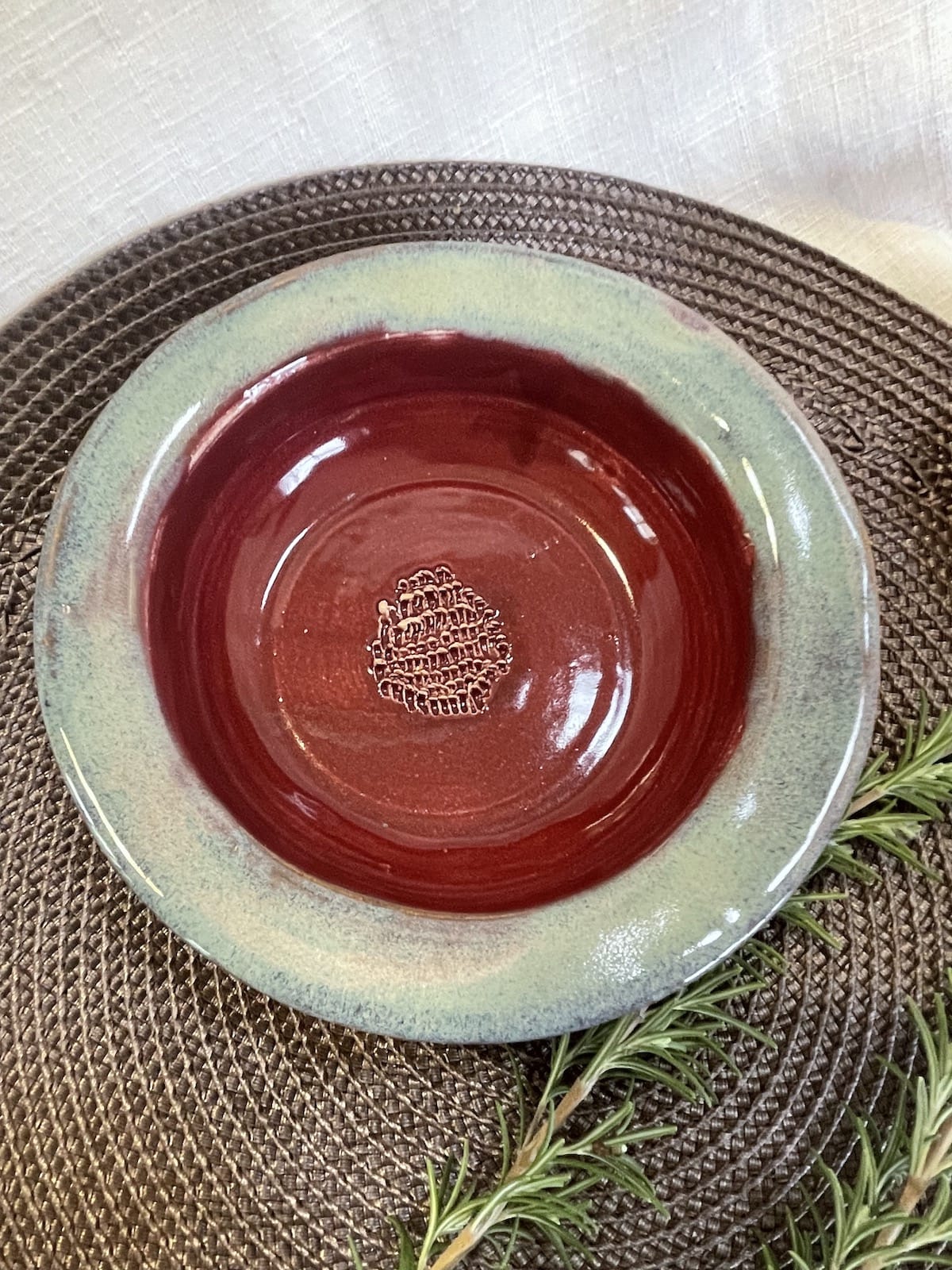 A hand-thrown garlic grater and olive oil dipping bowl finished in a deep cranberry red glaze with a soft blue rim. The textured center easily grates garlic for simple, flavorful serving at the table.
